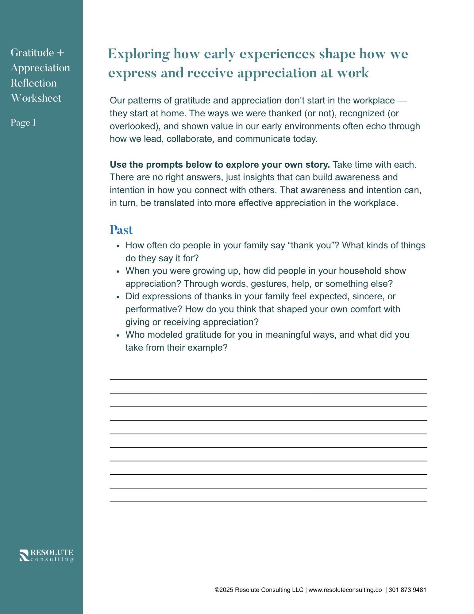 I've had some interesting conversations about gratitude recently, and they've got me thinking... what's the difference and the link between gratitude and appreciation? Full disclosure: many of those "interesting conversations" came from a place of hurt feelings - mine and others. I know myself well enough to see that leading with curiosity keeps me out of judgement, so I decided to put some research around my hurt feelings instead of just getting mad! As I unpacked those conversations, I found it helpful to clarify the language - what exactly are we talking about when we say we feel grateful or appreciated? Gratitude is an internal emotional state. It's often retrospective and focused on the receiver’s experience. It’s the felt sense of thankfulness for benefits received, experiences, or people encountered. Appreciation, by contrast, is an outward expression. It's proactive or ongoing, centered on the giver’s recognition or affirmation. They’re two sides of the same experience. In business, these two sides could show up as a manager feeling gratitude for how the team stayed late to meet a client deadline - an internal acknowledgment of others’ efforts or support. That's only translated to appreciation when it's expressed to the team, perhaps verbally or in writing: "Your commitment this week made a real difference for our client. Thank you." At home, a partner may be sincerely grateful for a meal cooked or a household task handled. However, without the expression of appreciation (often as simple as "thank you"), that gratitude never makes the alchemic transition to appreciation. When we experience that lack of alchemy, we're often clumsy in how we express it. We blame the person who didn’t express appreciation, instead of recognizing and naming our own unmet need to feel seen and appreciated. This shows up as "My boss/partner is ungrateful" rather than "I don't feel appreciated". These conversations then become about the feelings not the (in)actions, and spiral fast! As individuals, we know that gratitude is good for us. As leaders, we must recognize that appreciation is vital for culture. Gratitude builds personal perspective; appreciation builds organizational trust. Here in the US, we're a few weeks away from Thanksgiving. Many families have shared rituals of thanks when they gather for the holiday. We're also coming to that time of year where there are holiday parties, annual retrospectives, and rituals of thanks at work. Whether at work or at home, I invite you to ask yourself: does your gratitude make it all the way to appreciation? Not ‘Am I grateful?’, but rather ‘Do the people I’m grateful for feel appreciated?’ If you’re unsure, the tools below offer a few ways to turn reflection into practice and there's an invitation to our year-end workshop - our way of turning the gratitude we feel for you into appreciation you can experience. Best, Joanna Kozlowski Founder, Resolute Consulting LLC Understanding Appreciation at WorkAppreciation at work, often referred to as recognition, supports culture, drives retention, and doesn't have to be expensive. It should, however, be intentional and individualized. This article, from the Center for Creative Leadership, gives dozens of practical tips on how to use gratitude to fuel up and increase your own resilience. It then explains how to make the transition from internally experienced gratitude to externally enacted appreciation. The Languages of Appreciation (AKA Love Languages at Work) are a key tool for understanding how to make sure your team knows how much they are valued. It recognizes that not everyone feels appreciation in the same way - or even in words! Our preferences and responses to appreciation are shaped from earliest childhood. As you consider your defaults and natural style, download our Origins of Appreciation reflection worksheet with a guided exercise to explore how early experiences shape how you give and receive appreciation at work. An invitation to our year-end workshop: Gather | Ground | Grow | GoRegistration is open for our annual friends and advocates appreciation workshop. This in-person event is our way of saying thank you to the community that supports the business year-round - it's where we turn our gratitude into appreciation. I learned fast that the people who help a business grow might never sign a contract. You attend programs, recommend me, bring me into rooms where I don't have access, make me better at my craft - and read my (officially occasional) newsletter! Our friends and advocates (you!) are the people who don't just make it possible; you make it fun. So, if you're in DC and would like to close out 2025 with intention and move into 2026 with purpose, check your calendars. I hope to see you there. You can register here and please reach out with any questions. If you're a Resolute client, you should have a separate email from us for something special - if you haven't seen that, please drop us a note. The small print/FAQ:
